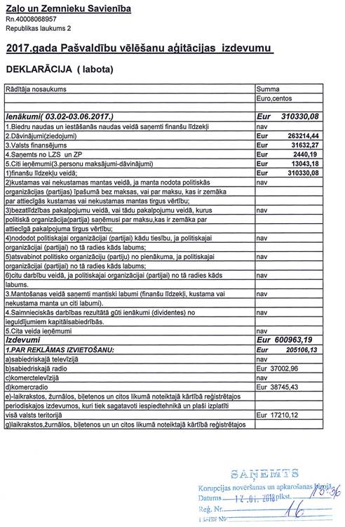 Politisko partiju apvienības "Zaļo un Zemnieku savienība", reģ. Nr. 40008068957, precizēta vēlēšanu ieņēmumu un izdevumu deklarācija