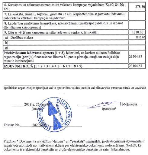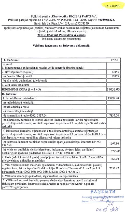 Politiskās partijas "Eiroskeptiķu Rīcības partija", reģ. Nr. 40008045333, precizēta vēlēšanu ieņēmumu un izdevumu deklarācija