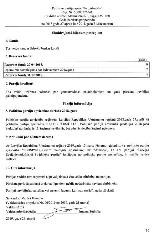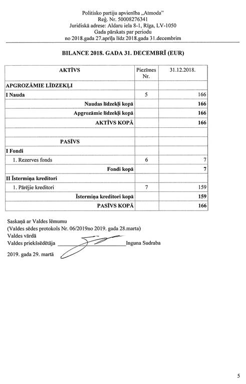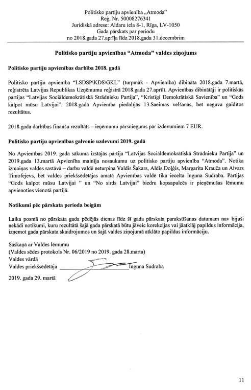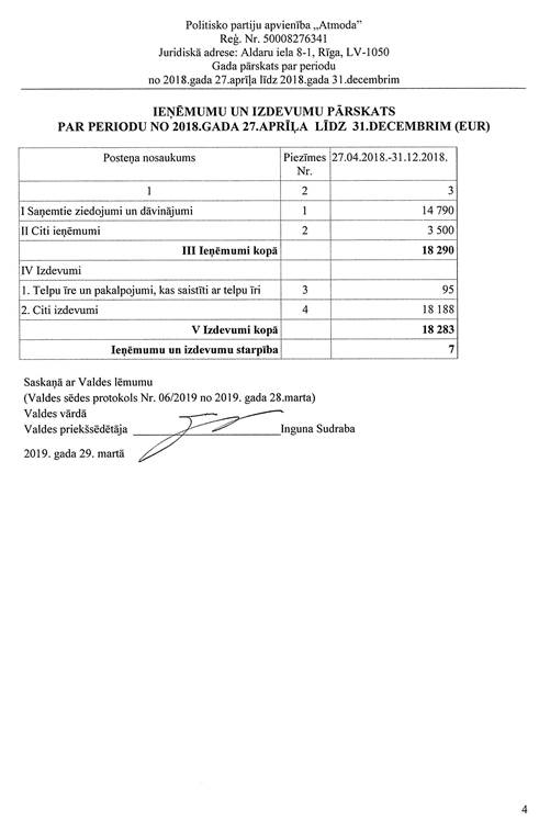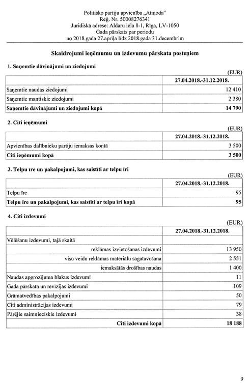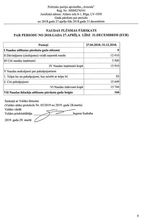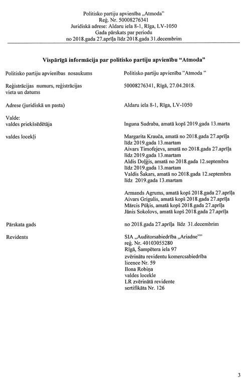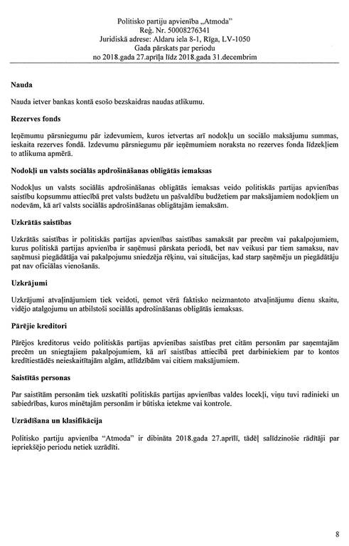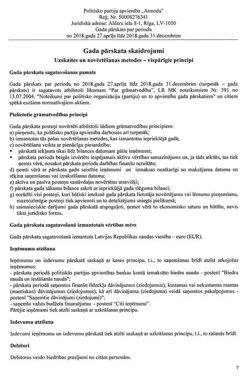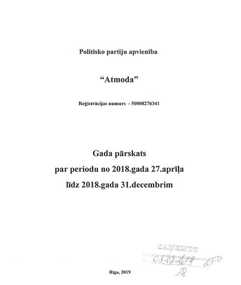 Politisko partiju apvienības "Atmoda", reģ. Nr. 50008276341, gada pārskats par 2018.gadu