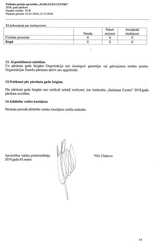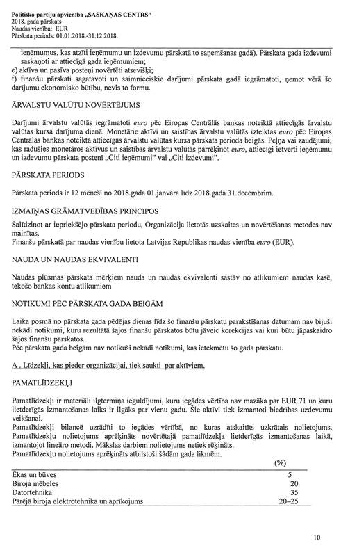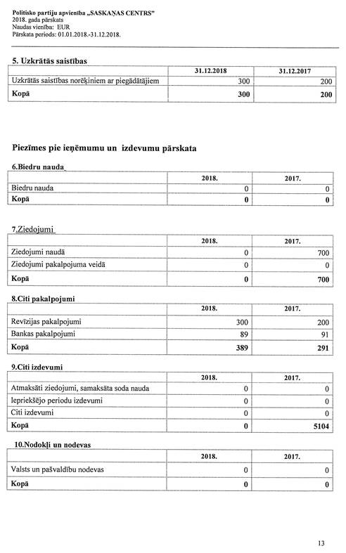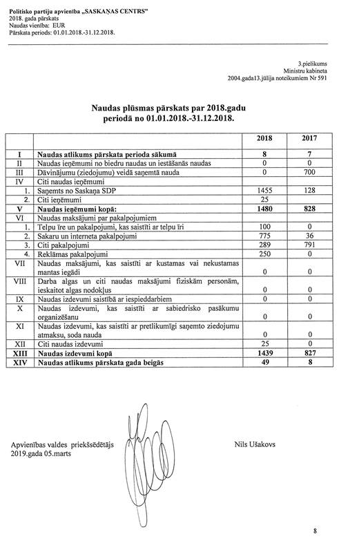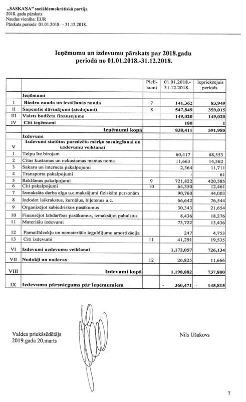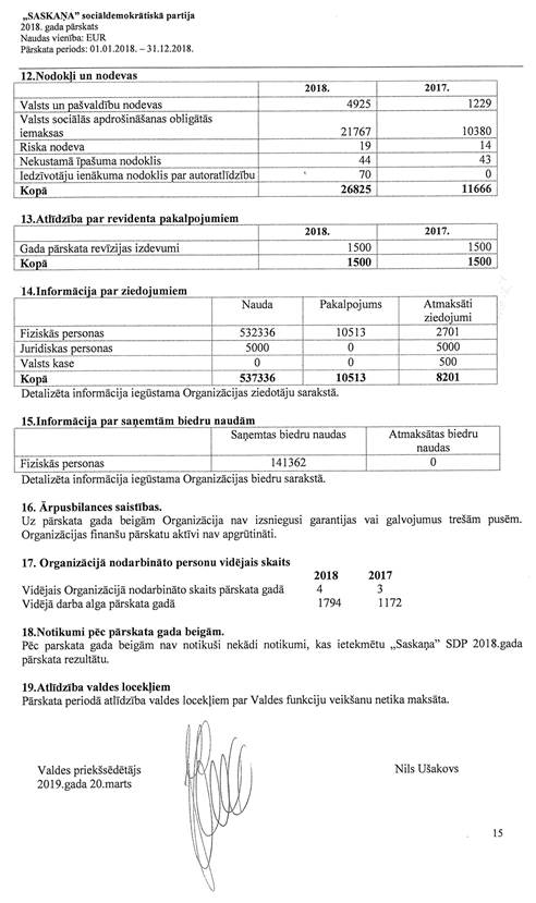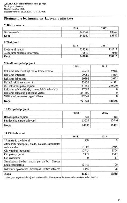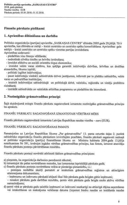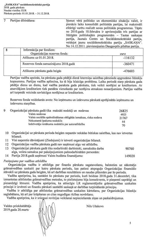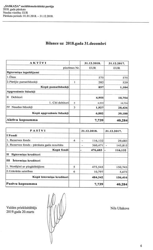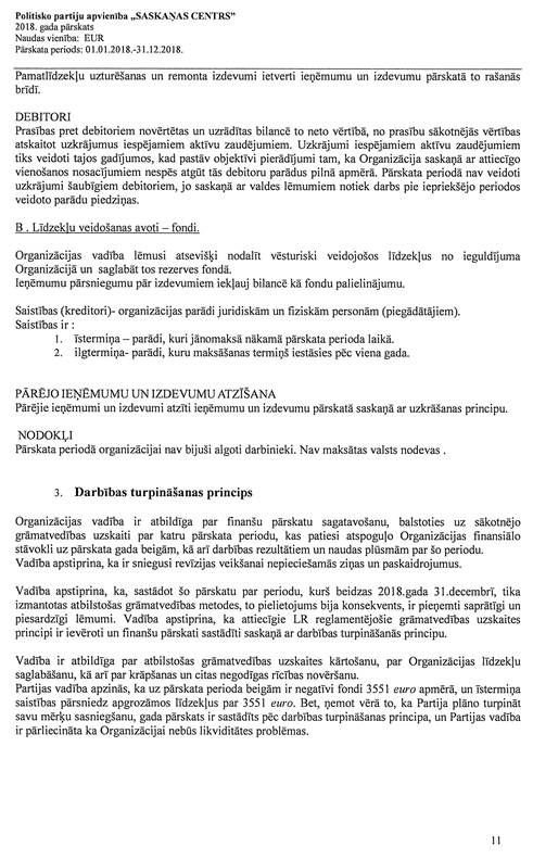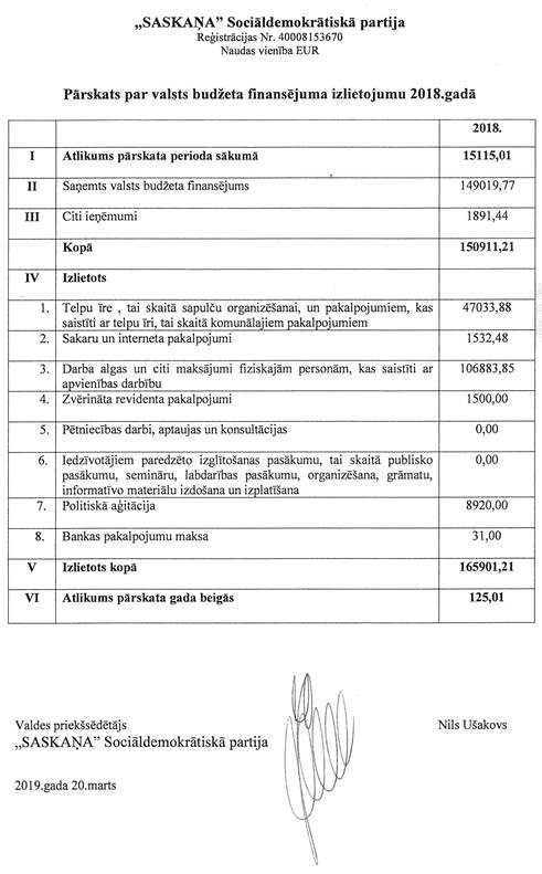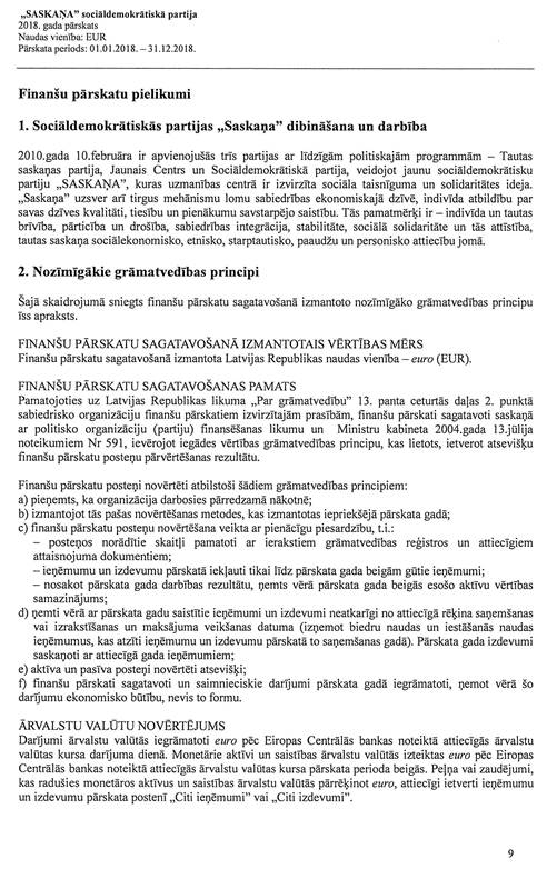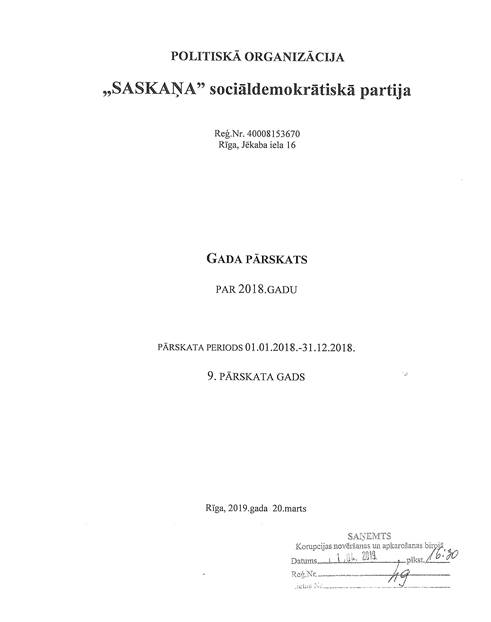 Politiskās partijas ""SASKAŅA" sociāldemokrātiskā partija", reģ. Nr. 40008153670, gada pārskats par 2018.gadu