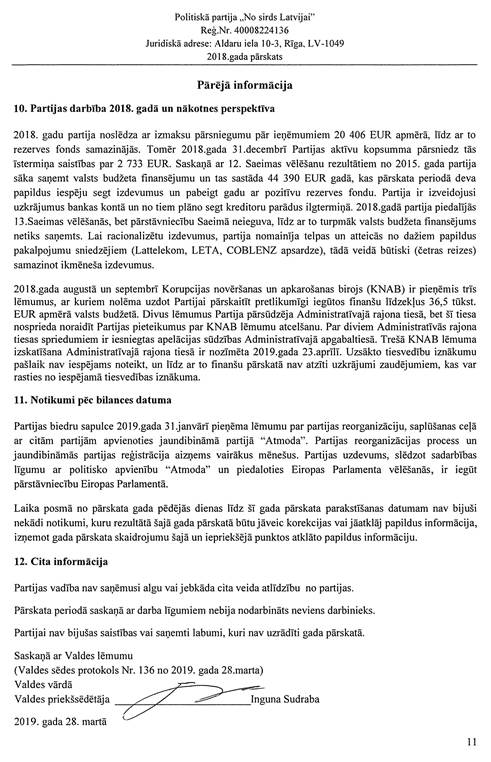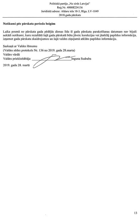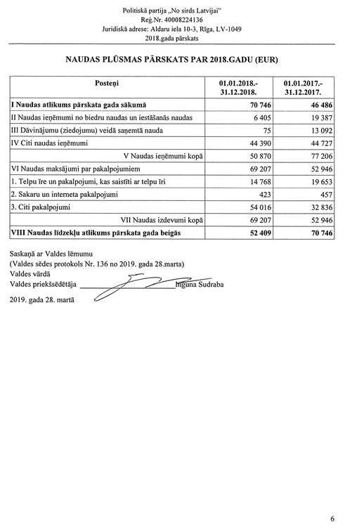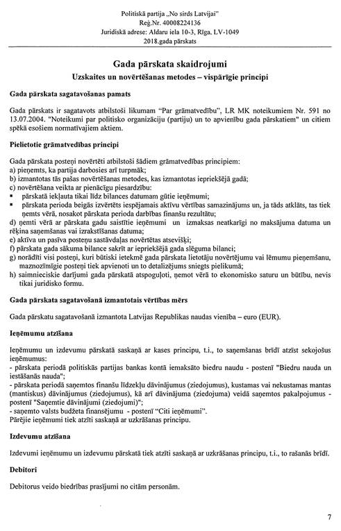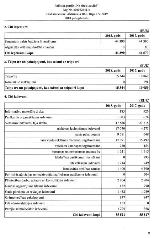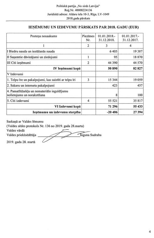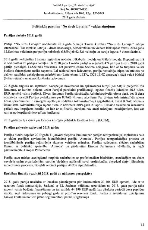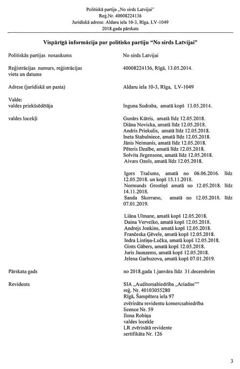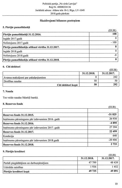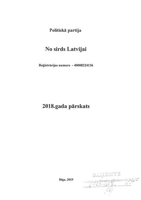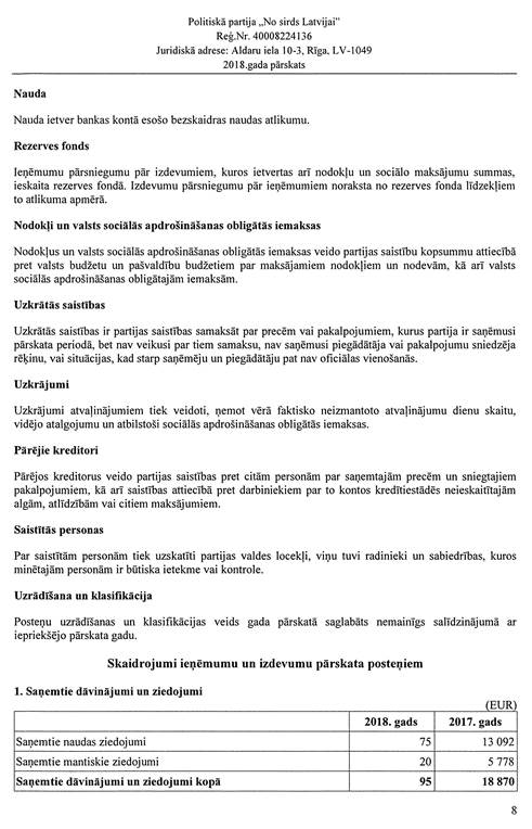 Politiskās partijas "No sirds Latvijai", reģ. Nr. 40008224136, gada pārskats par 2018.gadu