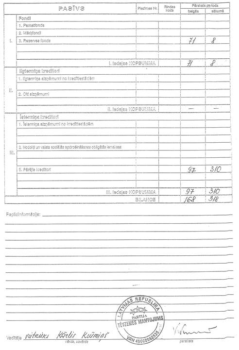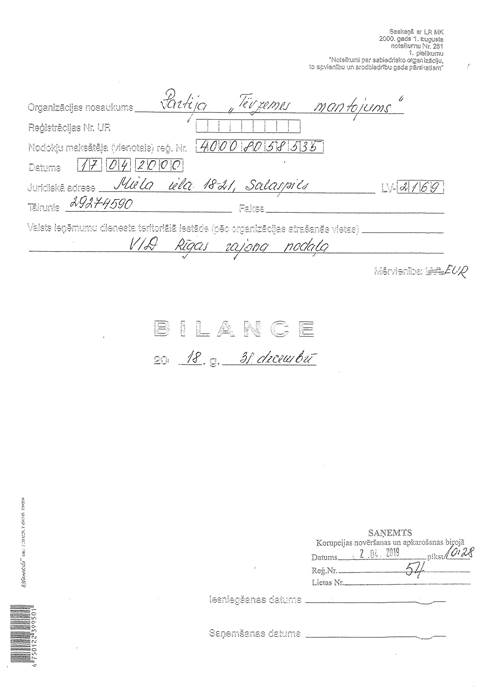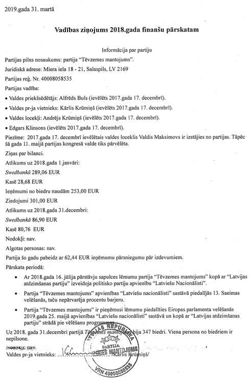 Politiskās partijas "Partija "Tēvzemes mantojums"", reģ. Nr. 40008058535, gada pārskats par 2018.gadu