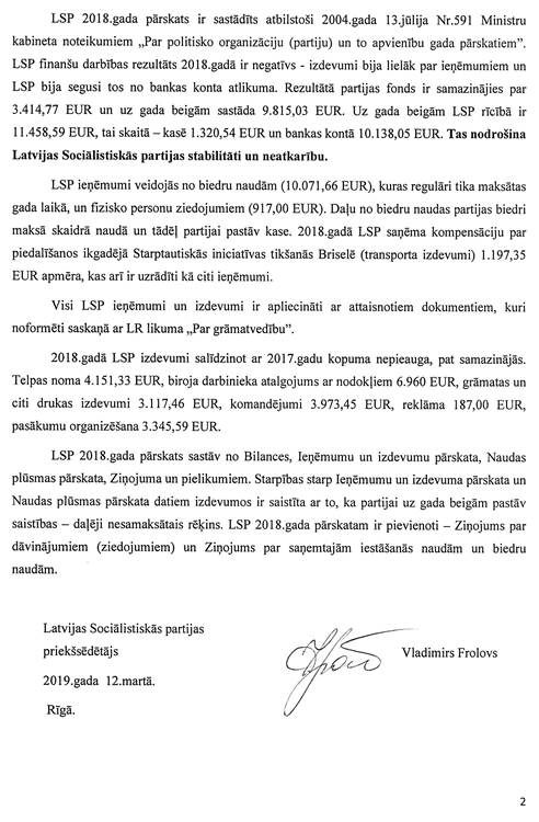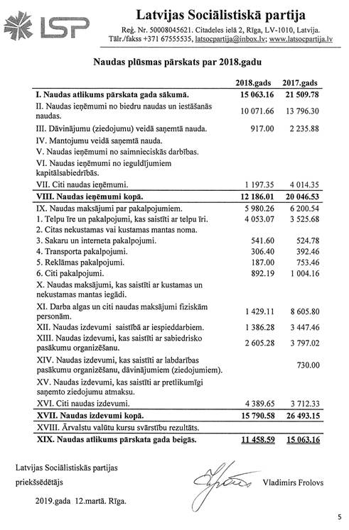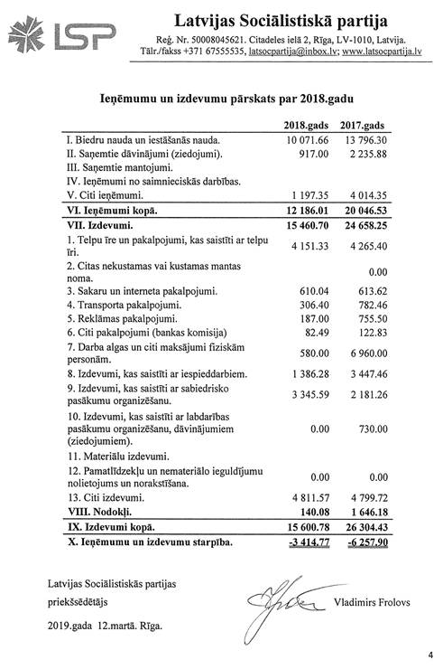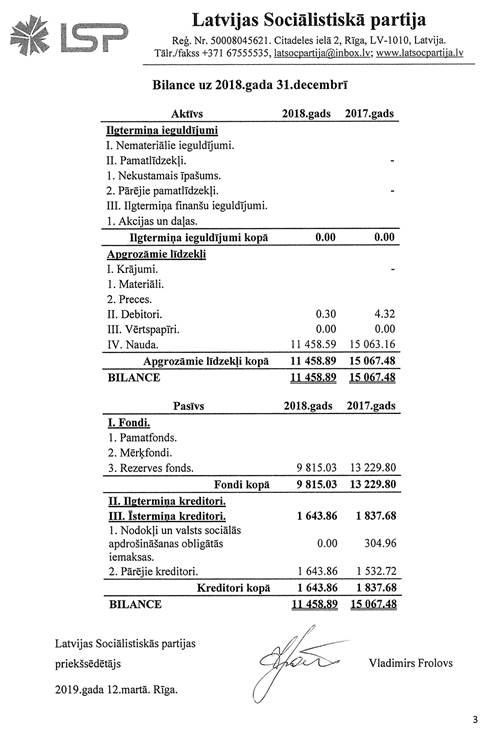 Politiskās partijas "Latvijas Sociālistiskā partija", reģ. Nr. 50008045621, gada pārskats par 2018.gadu