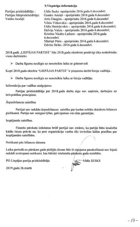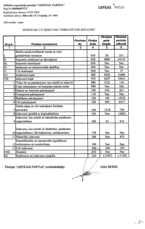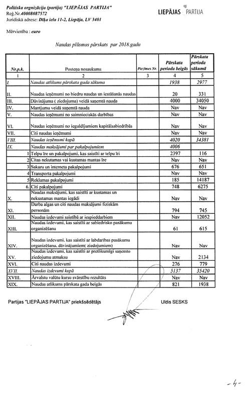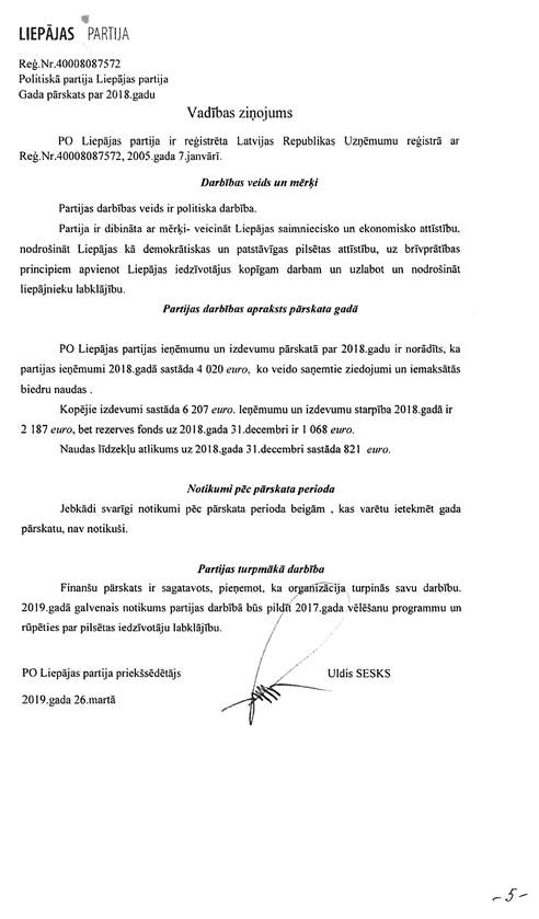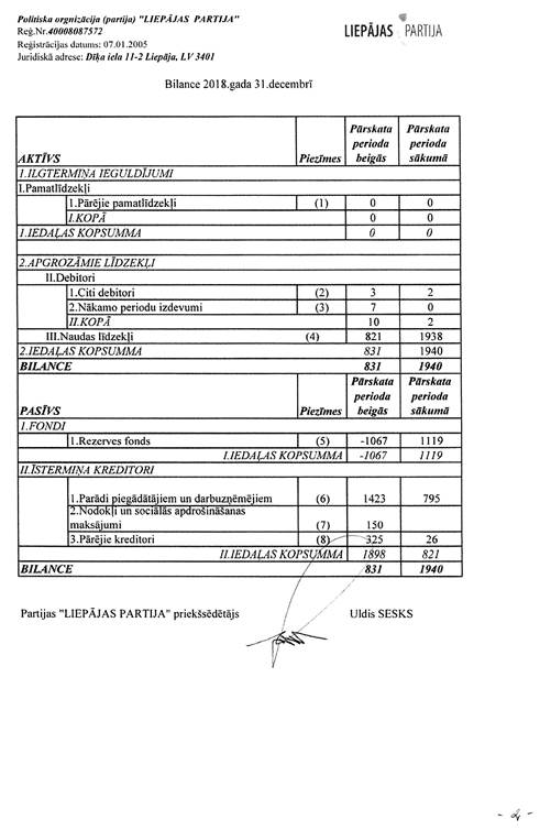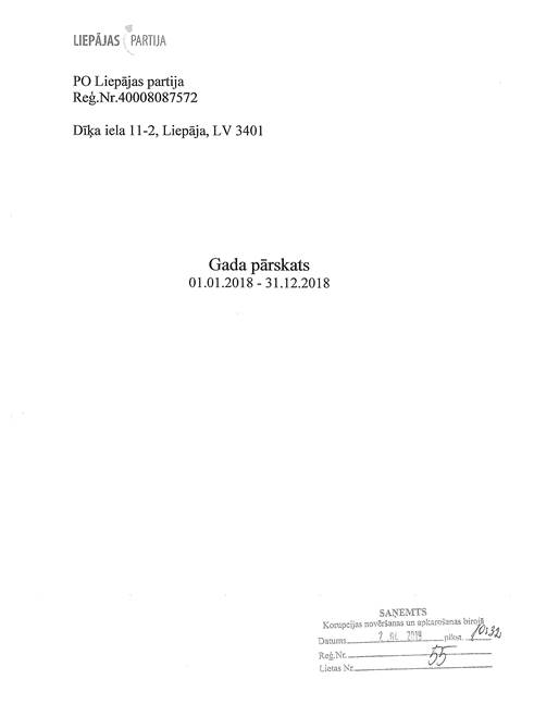 Politiskās partijas "Liepājas partija", reģ. Nr. 40008087572, gada pārskats par 2018.gadu