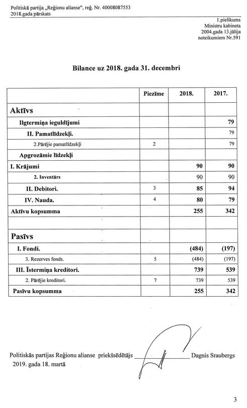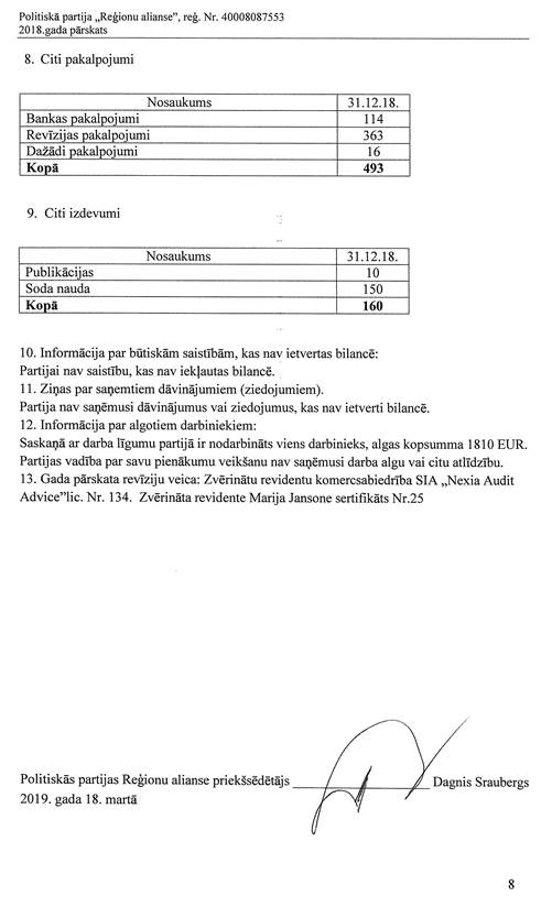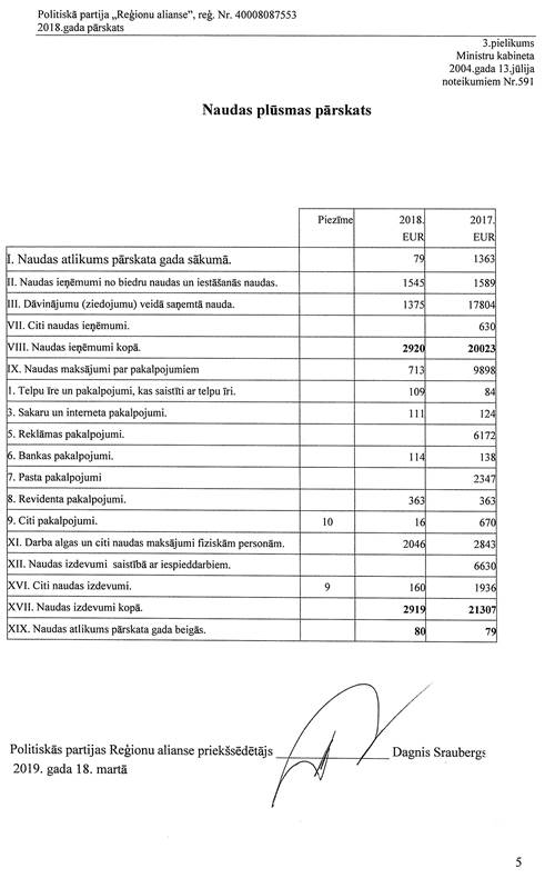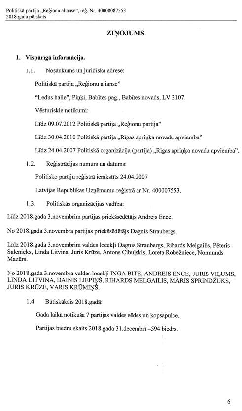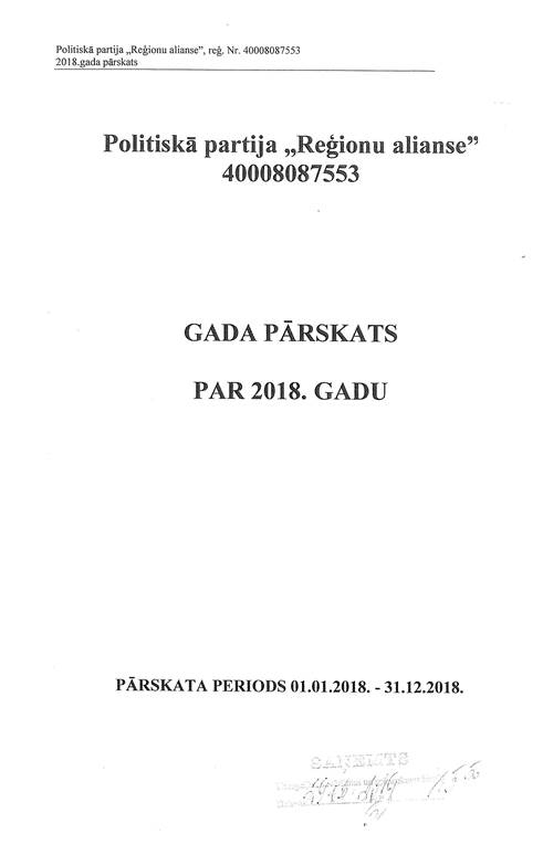 Politiskās partijas "Reģionu alianse", reģ. Nr. 40008087553, gada pārskats par 2018.gadu