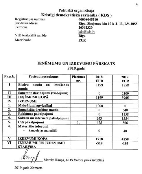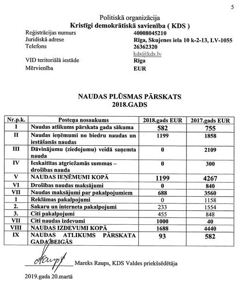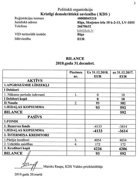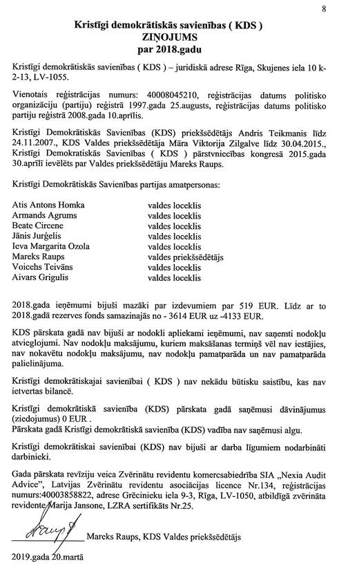 Politiskās partijas "Kristīgi demokrātiskā savienība", reģ. Nr. 40008045210, gada pārskats par 2018.gadu