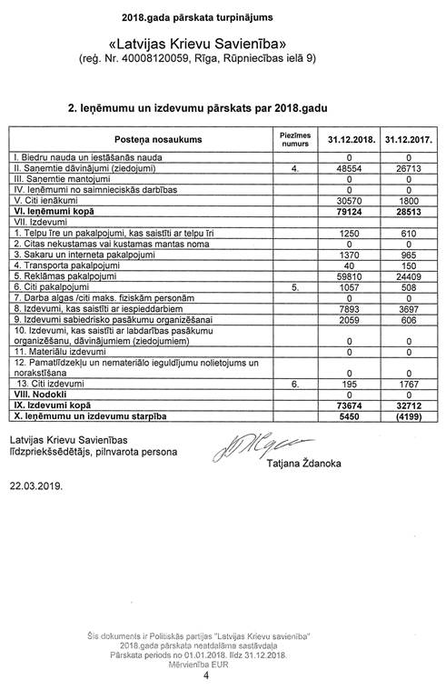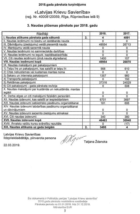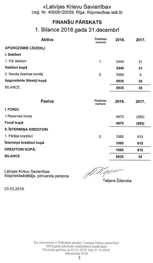 Politiskās partijas "Latvijas Krievu savienība", reģ. Nr. 40008120059, gada pārskats par 2018.gadu