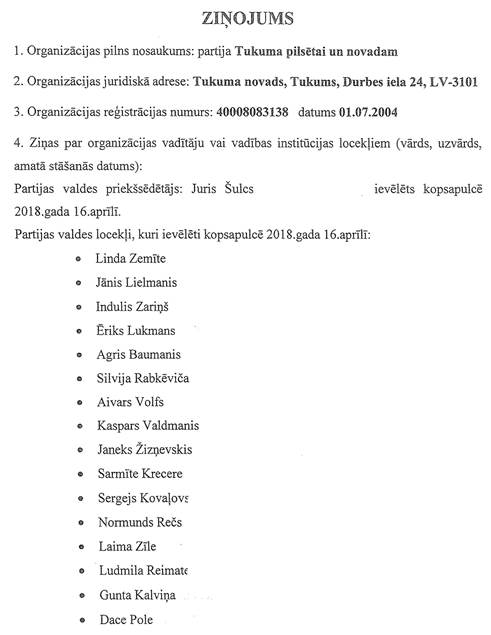 Politiskās partijas "Tukuma pilsētai un novadam", reģ. Nr. 40008083138, gada pārskats par 2018.gadu