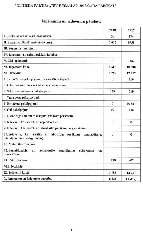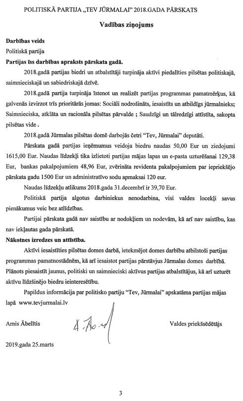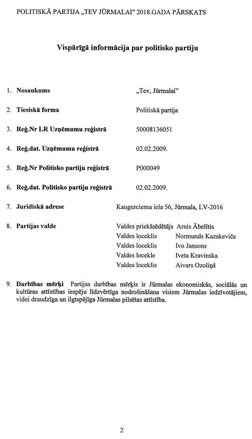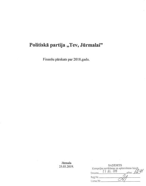 Politiskās partijas "Tev, Jūrmalai", reģ. Nr. 50008136051, gada pārskats par 2018.gadu