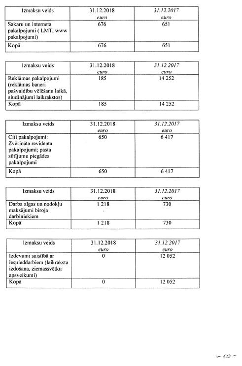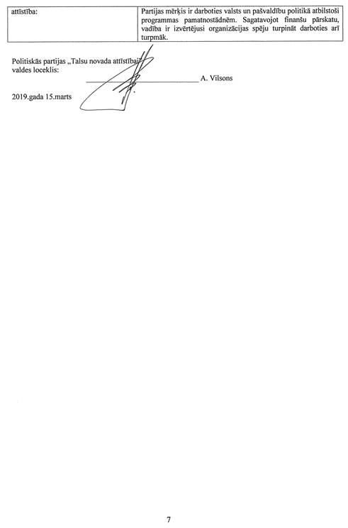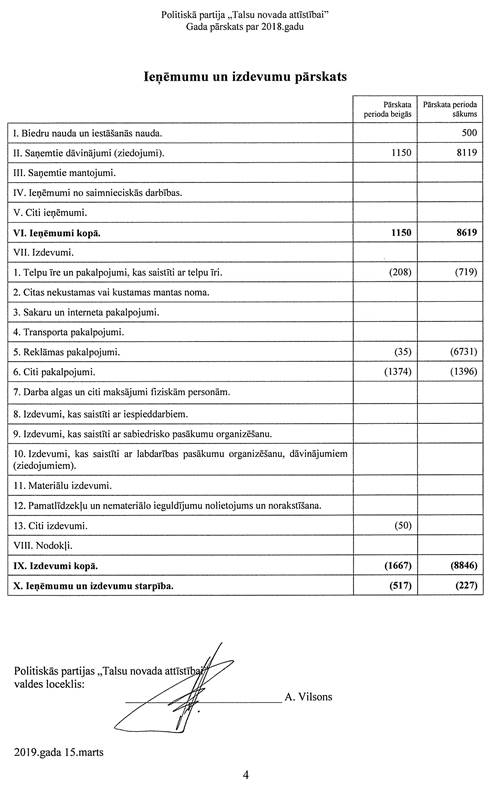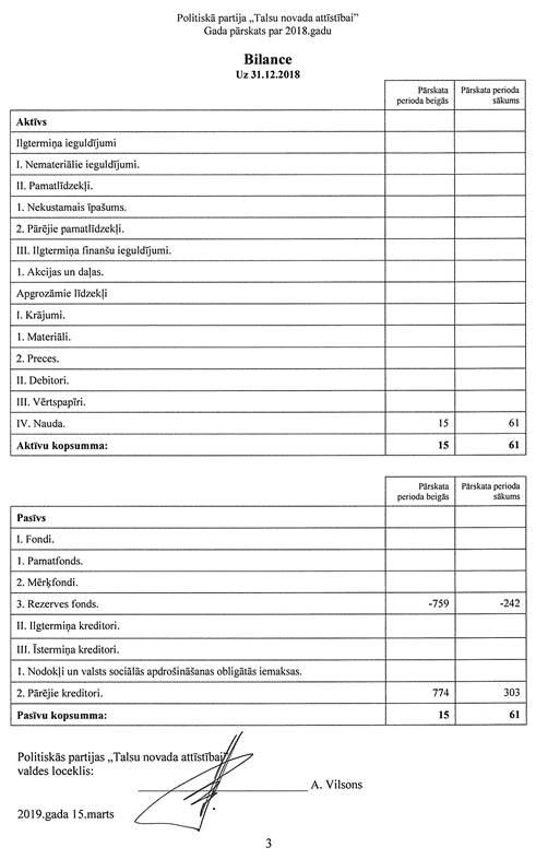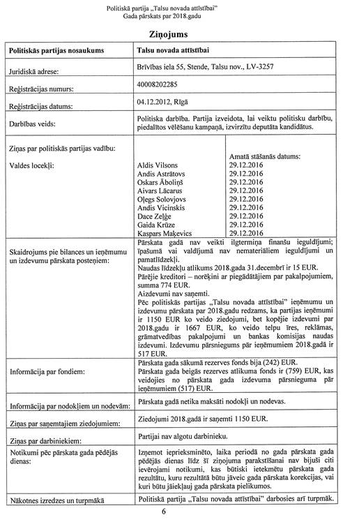 Politiskās partijas "Talsu novada attīstībai", reģ. Nr. 40008202285, gada pārskats par 2018.gadu