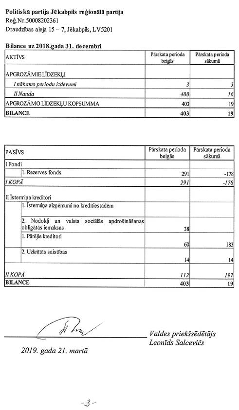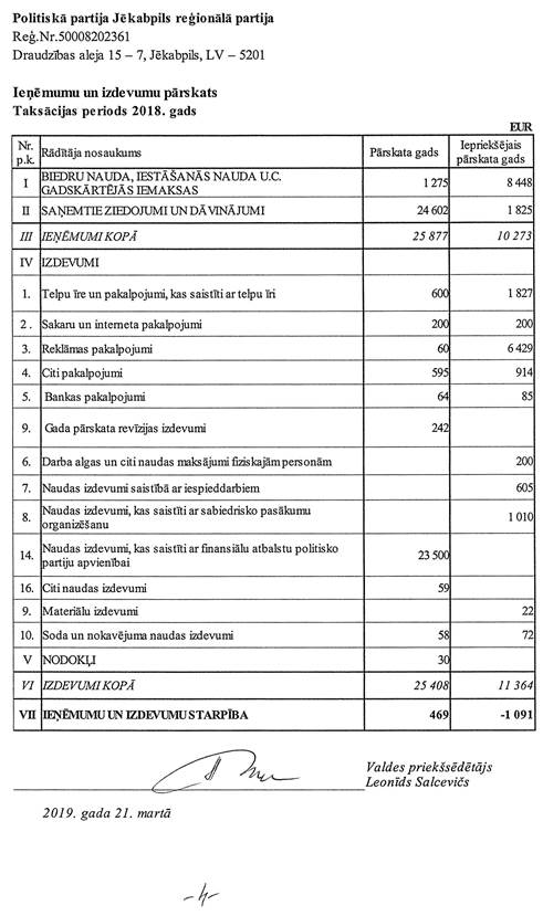 Politiskās partijas "Jēkabpils reģionālā partija", reģ. Nr. 50008202361, gada pārskats par 2018.gadu