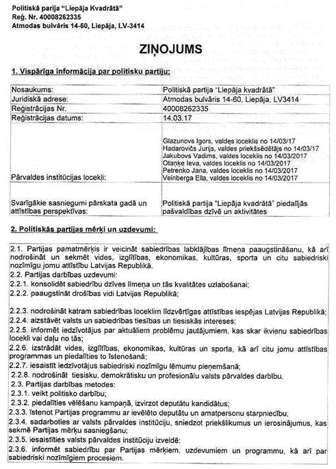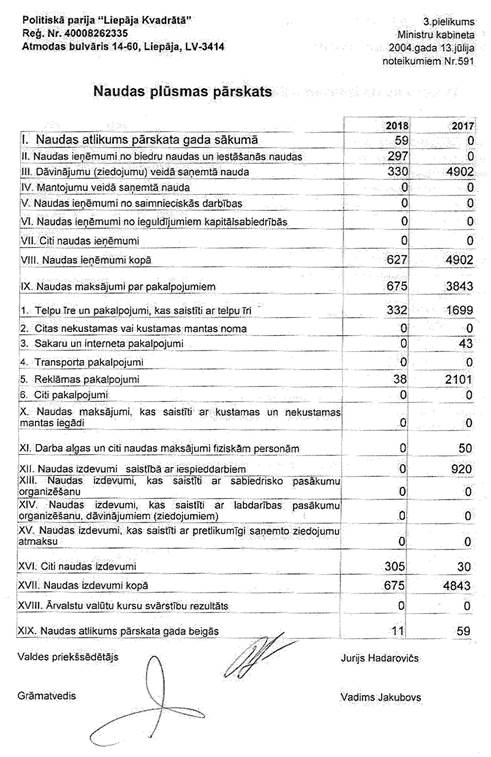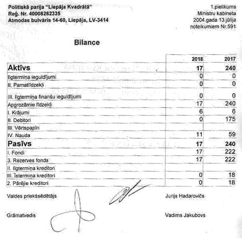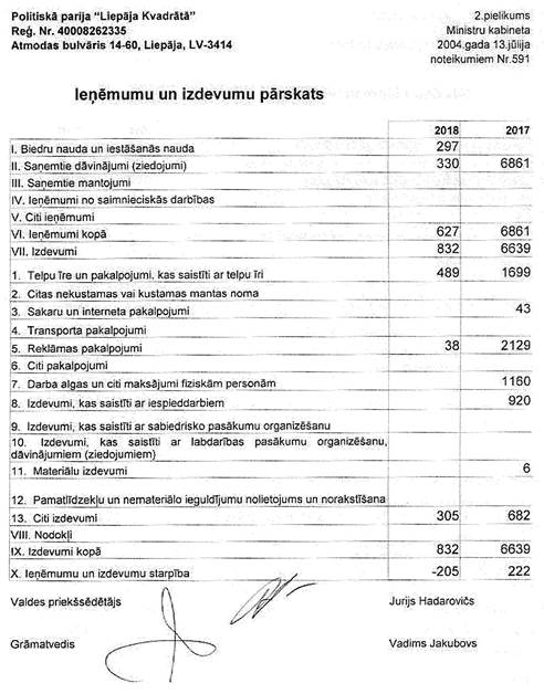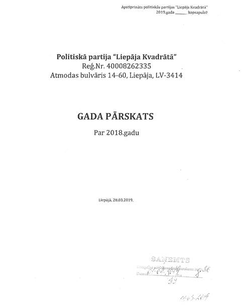 Politiskās partijas "LIEPĀJA KVADRĀTĀ", reģ. Nr. 40008262335, gada pārskats par 2018.gadu