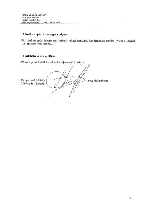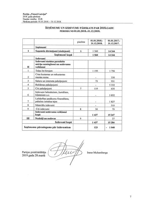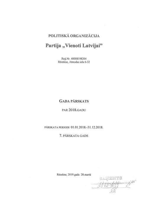 Politiskās partijas "Partija "Vienoti Latvijai"", reģ. Nr. 40008198204, gada pārskats par 2018.gadu