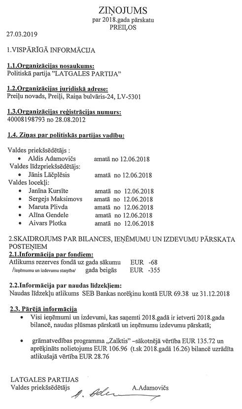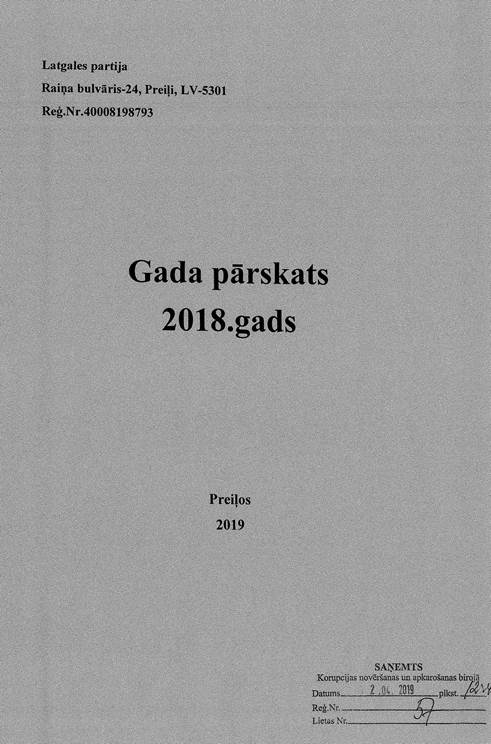 Politiskās partijas "Latgales partija", reģ. Nr. 40008198793, gada pārskats par 2018.gadu