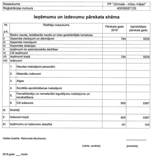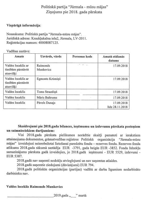 Politiskās partijas "Jūrmala - mūsu mājas", reģ. Nr. 40008087125, gada pārskats par 2018.gadu