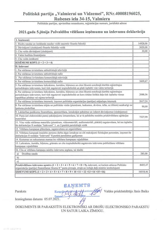Politiskās partijas "Valmierai un Vidzemei", reģ. Nr. 40008196025, vēlēšanu ieņēmumu un izdevumu deklarācija