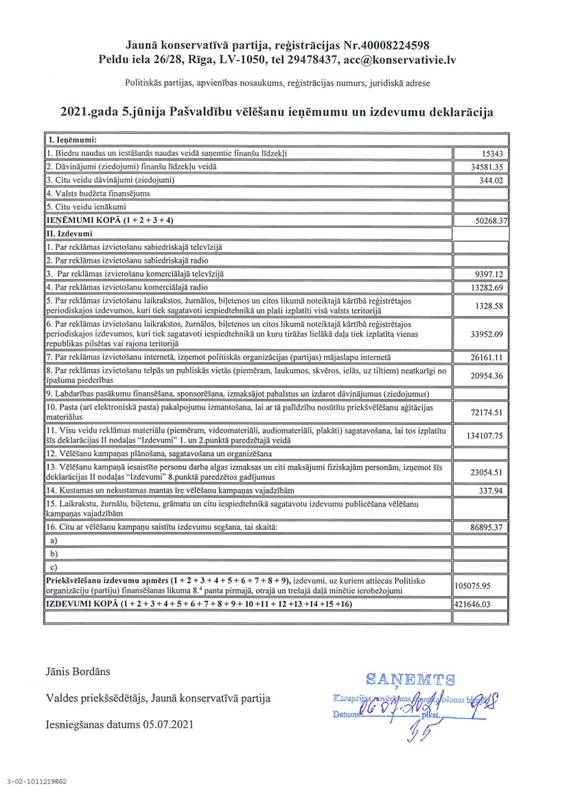 Politiskās partijas "Jaunā konservatīvā partija", reģ. Nr.40008224598, vēlēšanu ieņēmumu un izdevumu deklarācija
