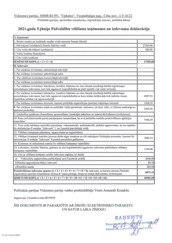 Politiskās partijas "VIDZEMES PARTIJA", reģ. Nr.50008181591, vēlēšanu ieņēmumu un izdevumu deklarācija