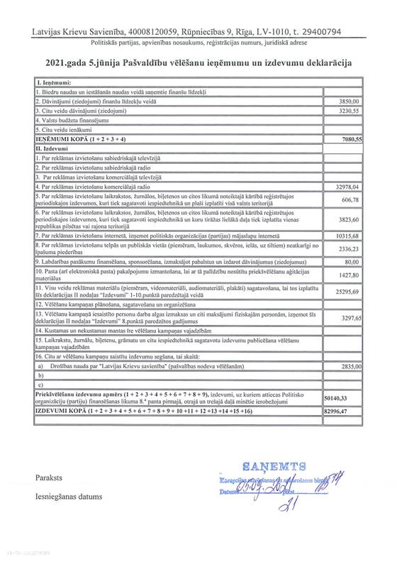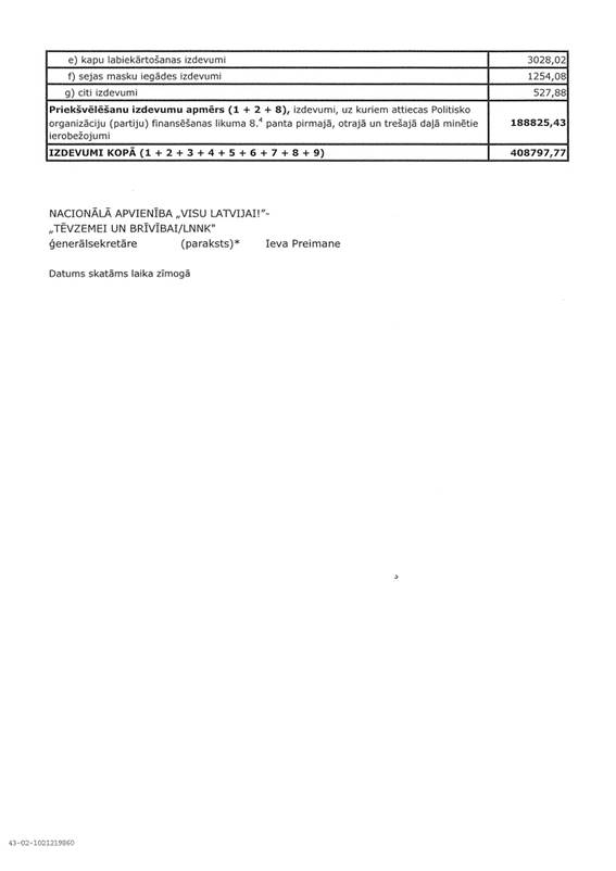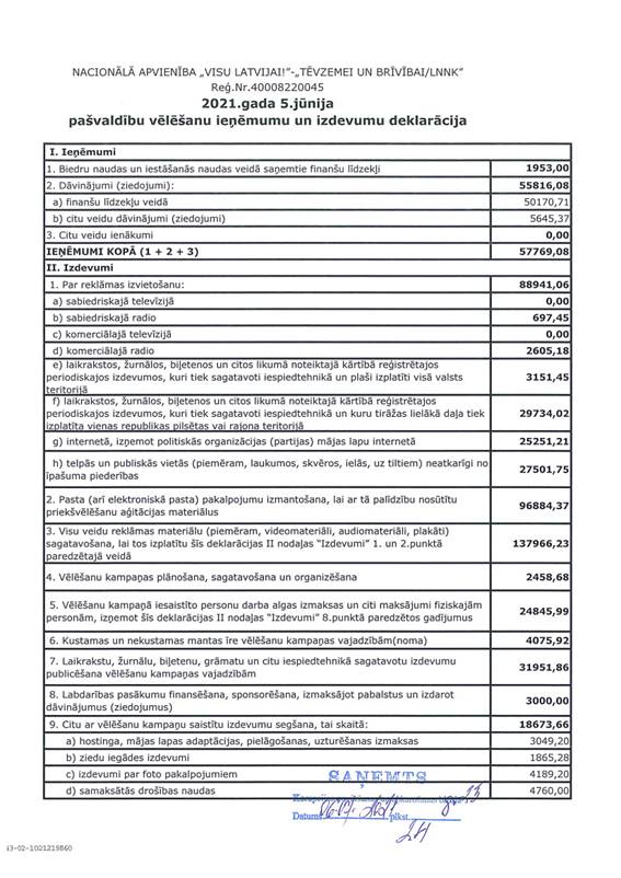 Politiskās partijas "NACIONĀLĀ APVIENĪBA "VISU LATVIJAI!"-"TĒVZEMEI UN BRĪVĪBAI/LNNK"", reģ. Nr. 40008220045, vēlēšanu ieņēmumu un izdevumu deklarācija