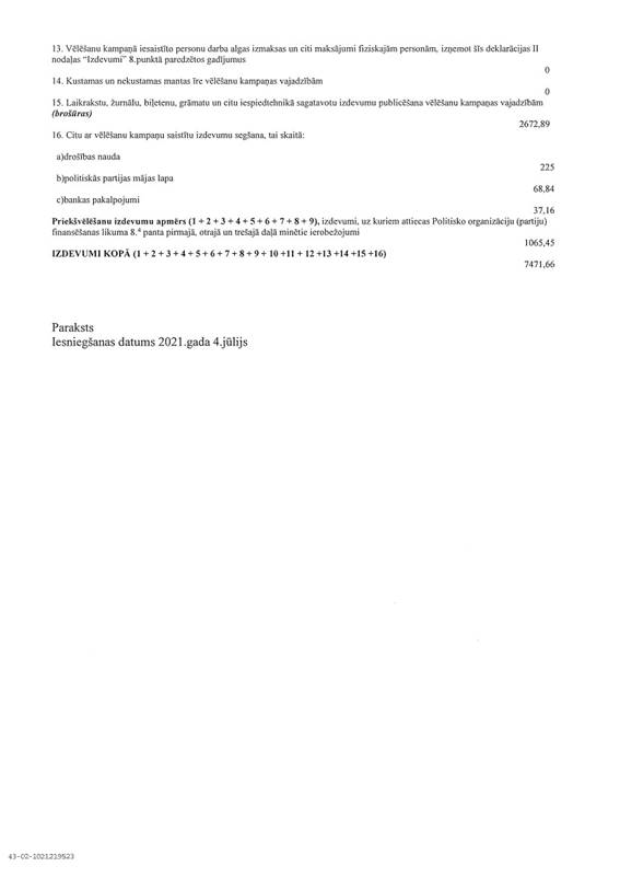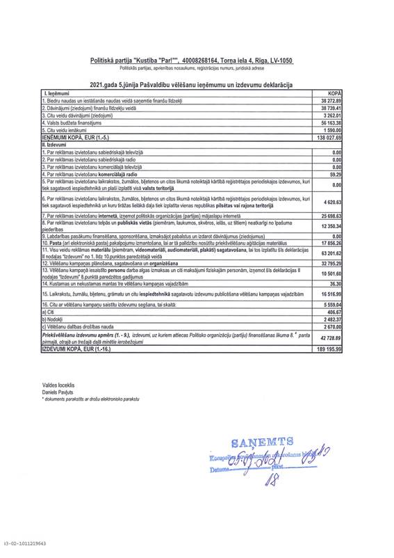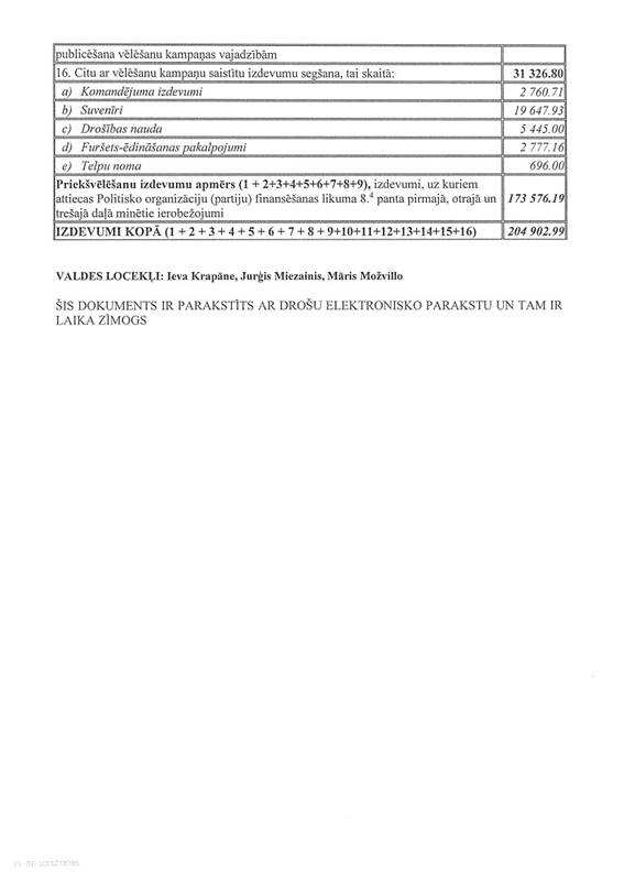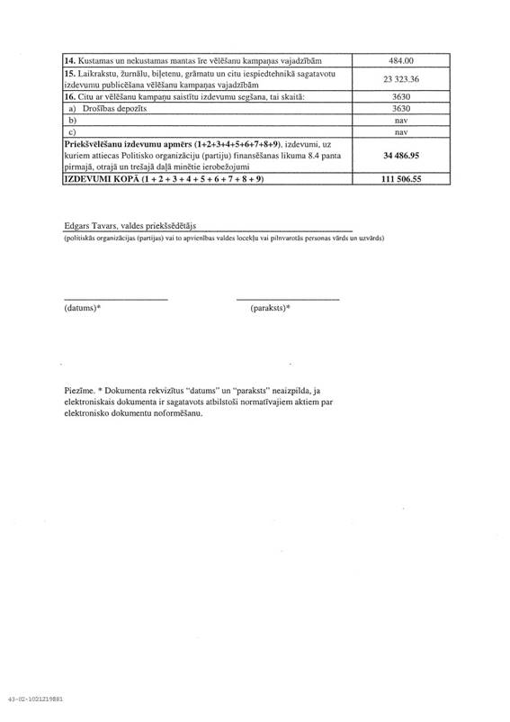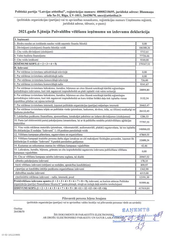 Politiskās partijas "Latvijas attīstībai", reģ. Nr. 40008218695, vēlēšanu ieņēmumu un izdevumu deklarācija