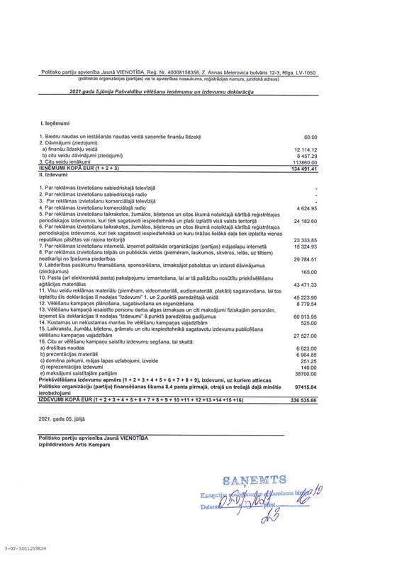 Politisko partiju apvienības "Jaunā VIENOTĪBA", reģ. Nr. 40008158358, vēlēšanu ieņēmumu un izdevumu deklarācija
