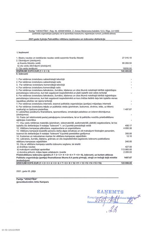 Politiskās partijas "Partija "Vienotība"", reģ. Nr. 40008185924, vēlēšanu ieņēmumu un izdevumu deklarācija