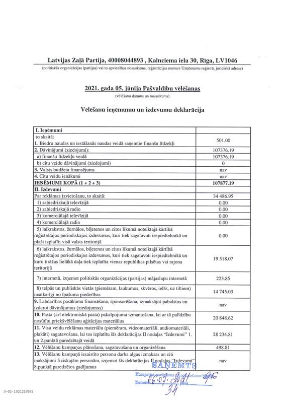 Politiskās partijas "Latvijas Zaļā partija", reģ. Nr. 40008044893, vēlēšanu ieņēmumu un izdevumu deklarācija