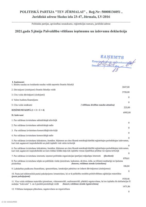 Politiskās partijas "Tev, JŪRMALAI", reģ. Nr. 50008136051, vēlēšanu ieņēmumu un izdevumu deklarācija