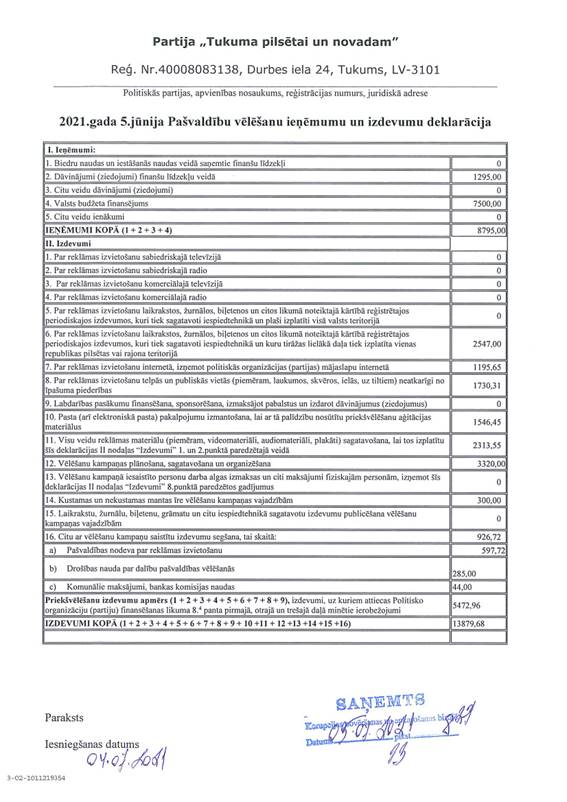 Politiskās partijas "Tukuma pilsētai un novadam", reģ. Nr. 40008083138, vēlēšanu ieņēmumu un izdevumu deklarācija