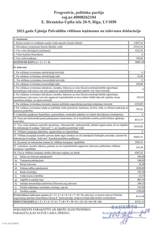 Politiskās partijas "PROGRESĪVIE", reģ. Nr. 40008262104, vēlēšanu ieņēmumu un izdevumu deklarācija