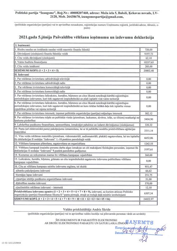 Politiskās partijas "Izaugsme", reģ. Nr.40008207460, vēlēšanu ieņēmumu un izdevumu deklarācija