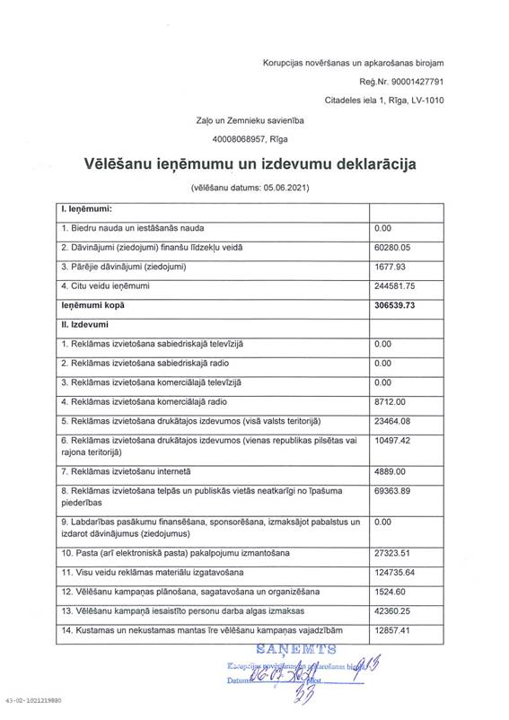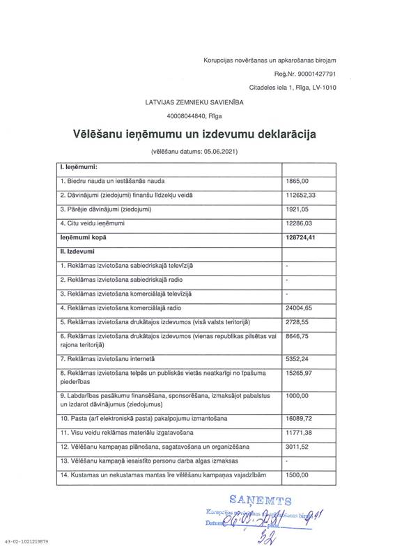 Politiskās partijas "LATVIJAS ZEMNIEKU SAVIENĪBA", reģ. Nr. 40008044840, vēlēšanu ieņēmumu un izdevumu deklarācija