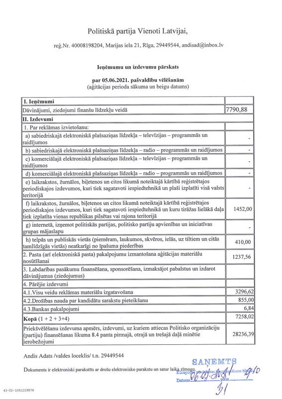Politiskās partijas "Vienoti Latvijai", reģ. Nr.40008198204, vēlēšanu ieņēmumu un izdevumu deklarācija
