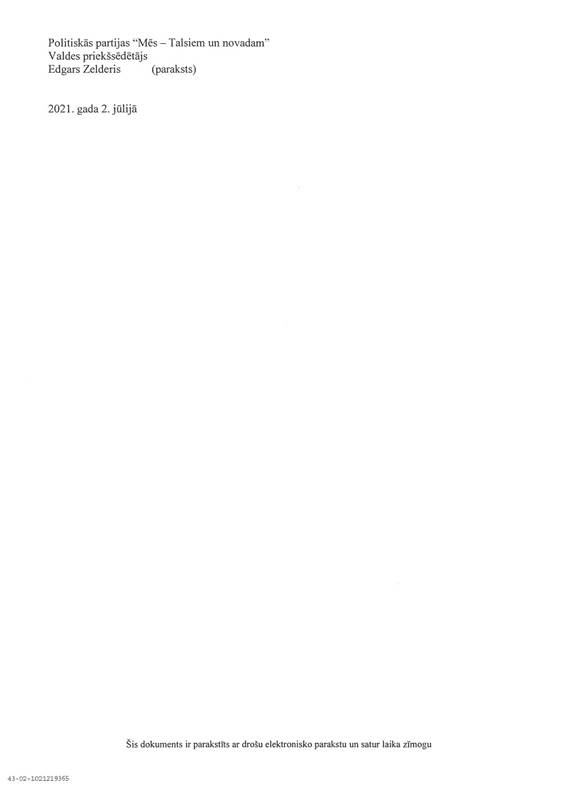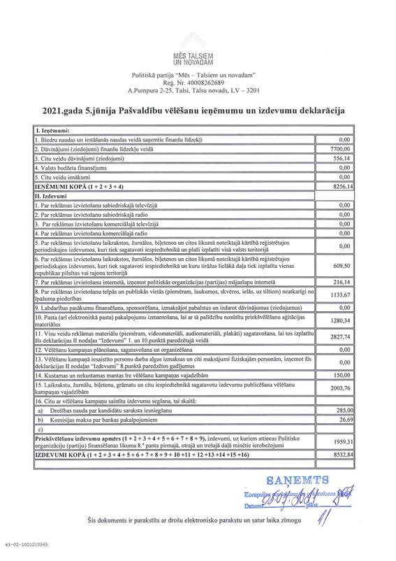 Politiskās partijas "Mēs - Talsiem un novadam", reģ. Nr. 40008262689, vēlēšanu ieņēmumu un izdevumu deklarācija