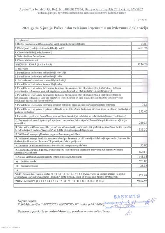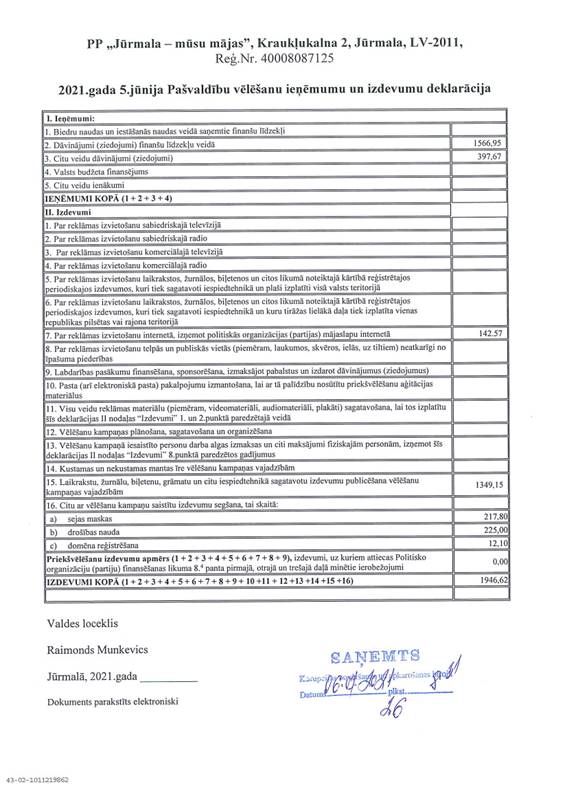 Politiskās partijas "Jūrmala - mūsu mājas", reģ. Nr. 40008087125, vēlēšanu ieņēmumu un izdevumu deklarācija