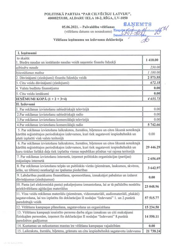 Politiskās partijas "PAR CILVĒCĪGU LATVIJU", reģ. Nr. 40008253188, vēlēšanu ieņēmumu un izdevumu deklarācija