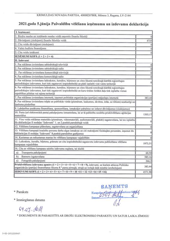 Politiskās partijas "KRIMULDAS NOVADA PARTIJA", reģ. Nr. 40008207808, vēlēšanu ieņēmumu un izdevumu deklarācija