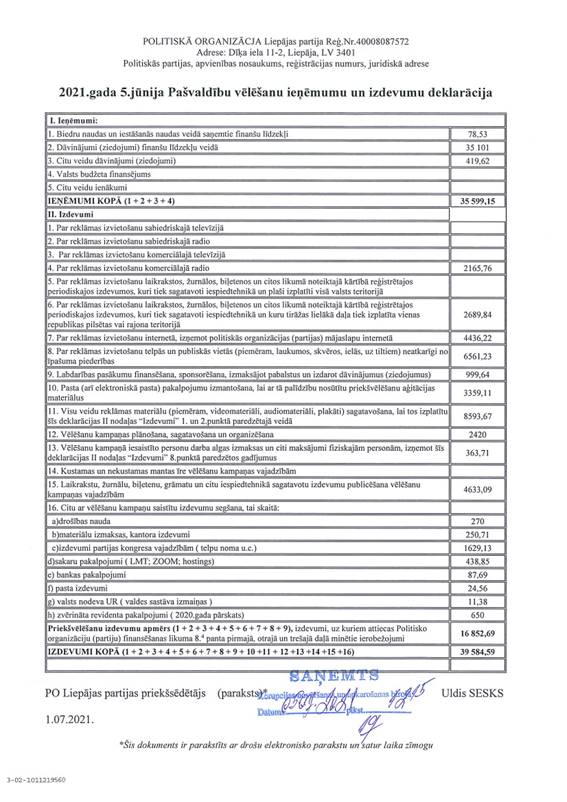 Politiskās partijas "LIEPĀJAS PARTIJA", reģ. Nr. 40008087572, vēlēšanu ieņēmumu un izdevumu deklarācija