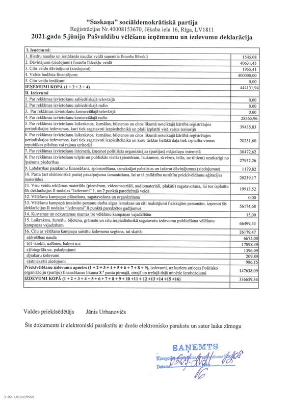 Politiskās partijas ""SASKAŅA" sociāldemokrātiskā partija", reģ. Nr. 40008153670, vēlēšanu ieņēmumu un izdevumu deklarācija