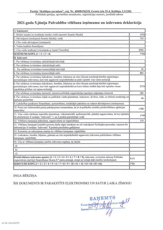 Politiskās partijas "Kuldīgas novadam", reģ. Nr. 40008196218, vēlēšanu ieņēmumu un izdevumu deklarācija