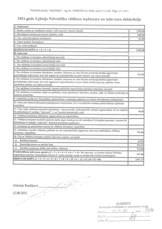 2021.gada 5.jūnija Pašvaldību vēlēšanu ieņēmumu un izdevumu deklarācijas precizējums