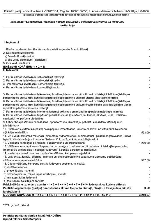 2021.gada 11.septembrī Rēzeknes novada domes vēlēšanu ieņēmumu un izdevumu deklarācija