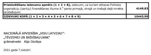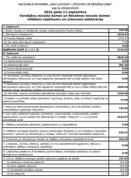 2021.gada 11.septembra vēlēšanu ieņēmumu un izdevumu deklarācija