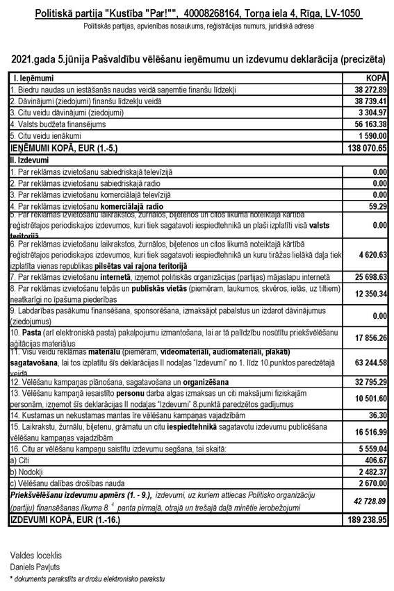 Politiskās partijas "Kustība "Par!"", reģ. Nr. 40008268164, precizēta 2021.gada 5.jūnija vēlēšanu ieņēmumu un izdevumu deklarācija