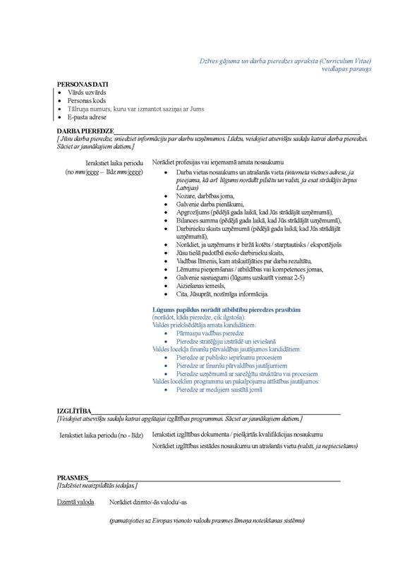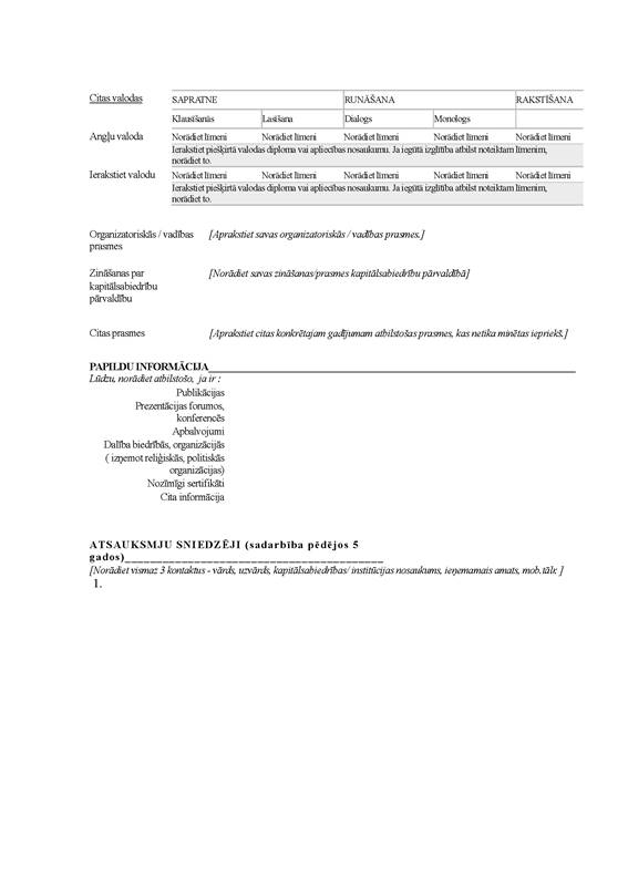 - dzīves gaitas un darba pieredzes apraksts par pēdējiem 15 gadiem (Curriculum Vitae, vēlams