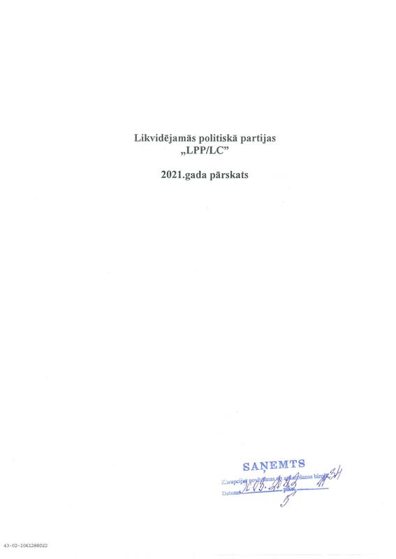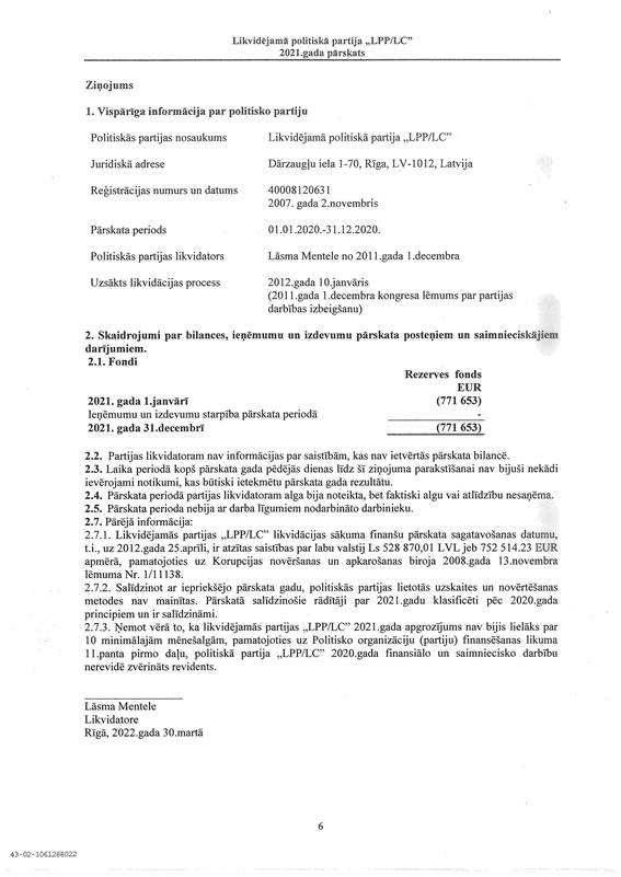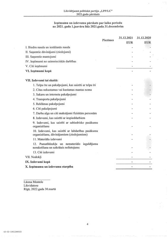 Likvidējamās politiskās partijas "LPP/LC", reģ. Nr. 40008120631, 2021.gada pārskats, EUR
