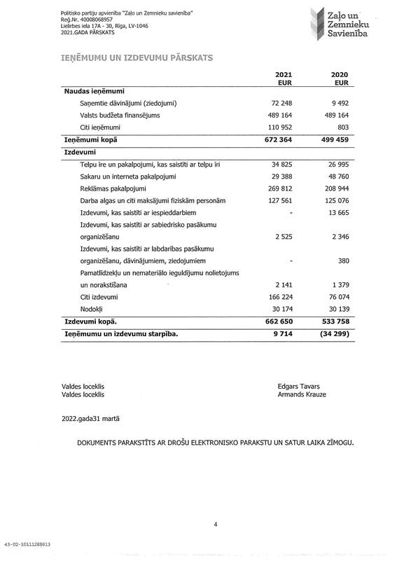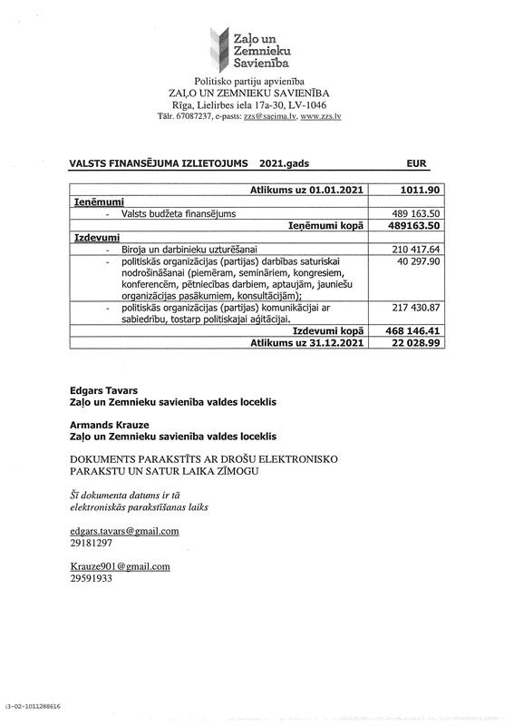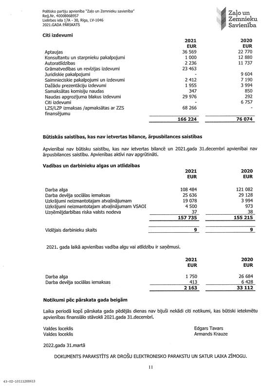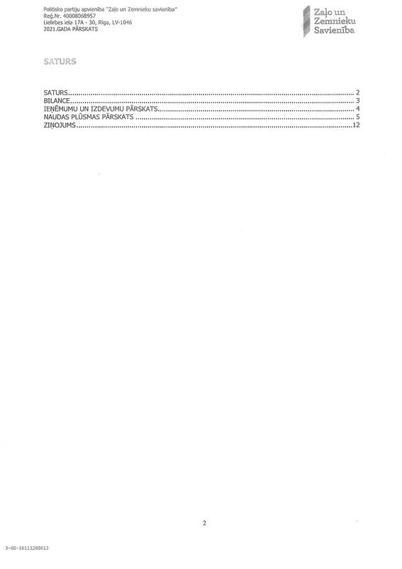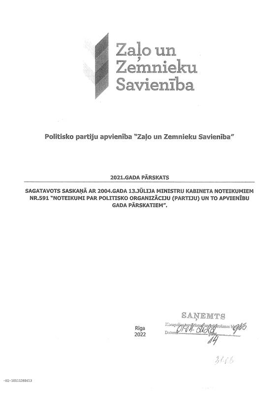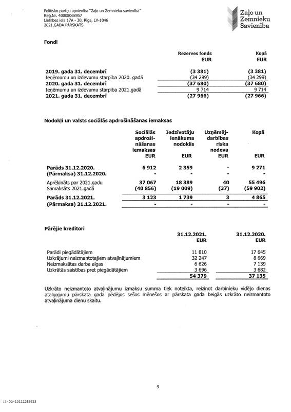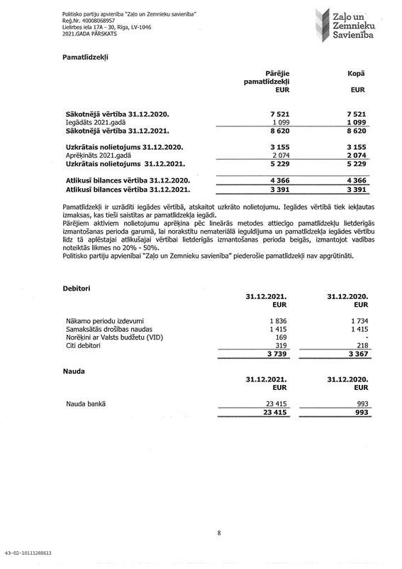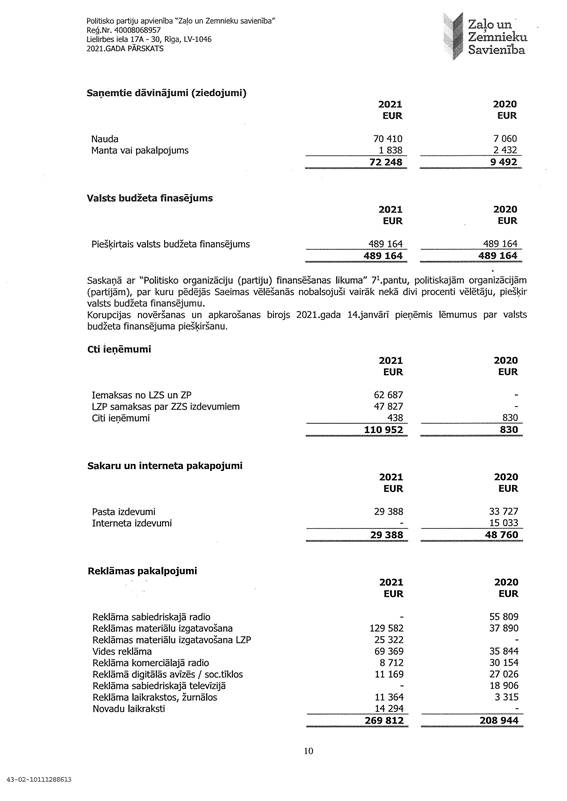 Politisko partiju apvienības "Zaļo un Zemnieku Savienība", reģ. Nr. 40008068957, 2021.gada pārskats, EUR
