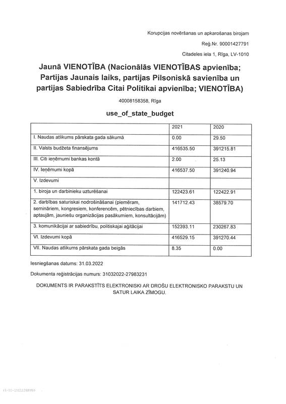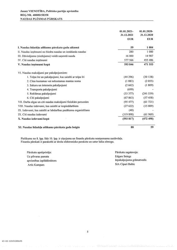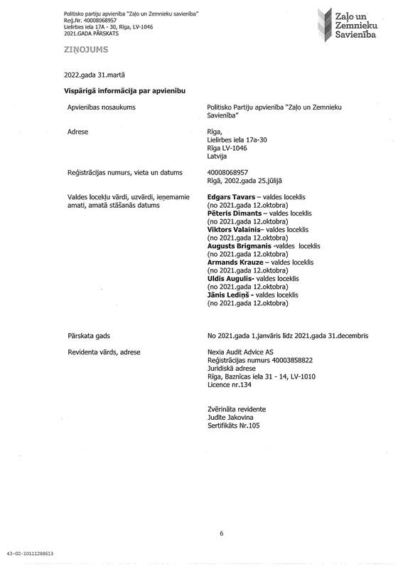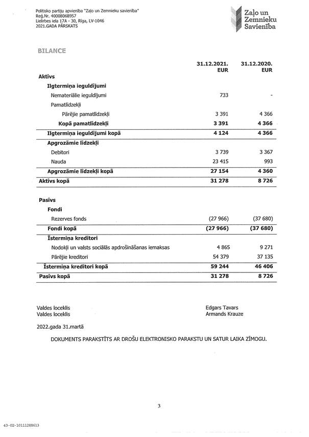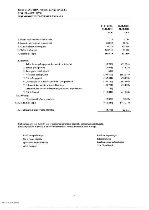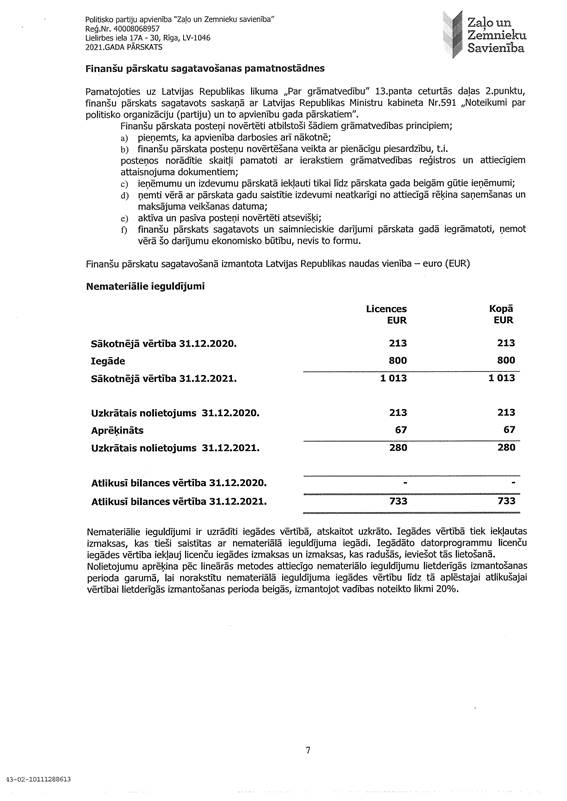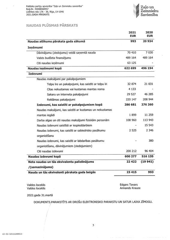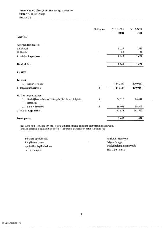 Politisko partiju apvienības "Zaļo un Zemnieku Savienība", reģ. Nr. 40008068957, 2021.gada pārskats, EUR