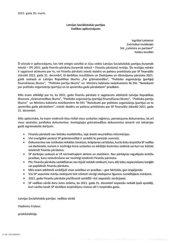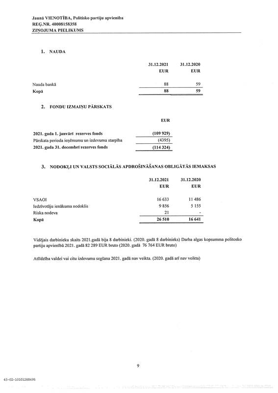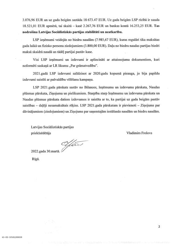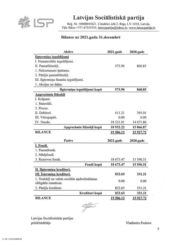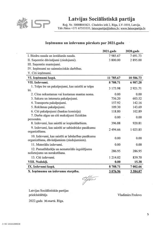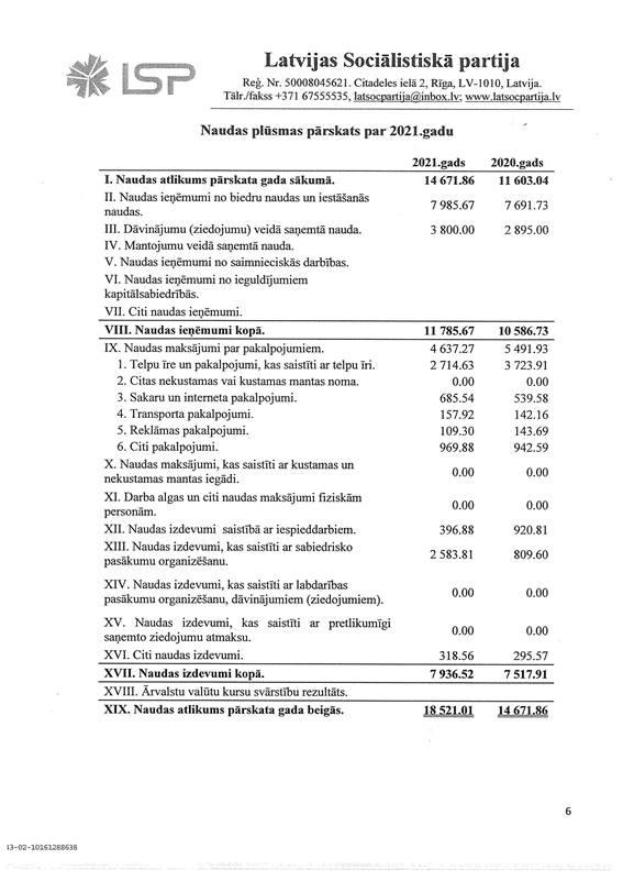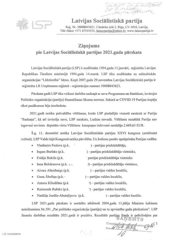 Politiskās partijas "Latvijas Sociālistiskā partija", reģ. Nr. 50008045621, 2021.gada pārskats, EUR