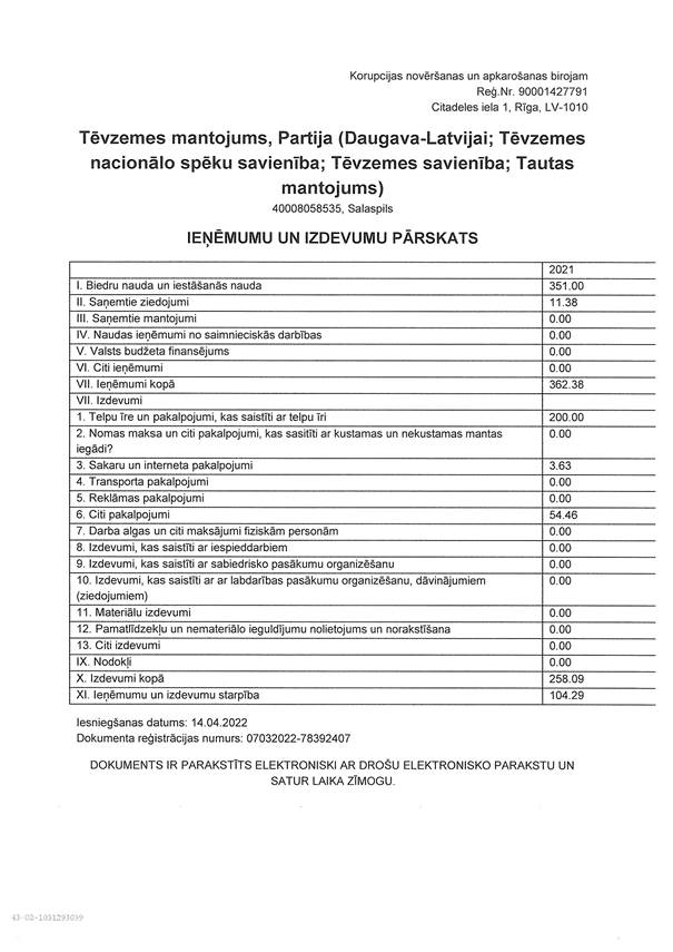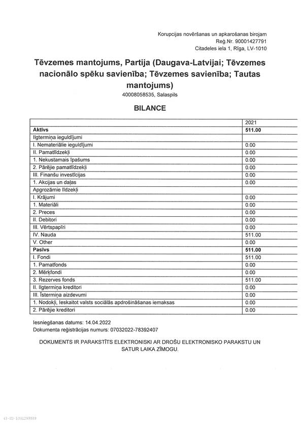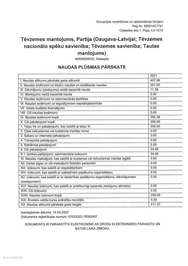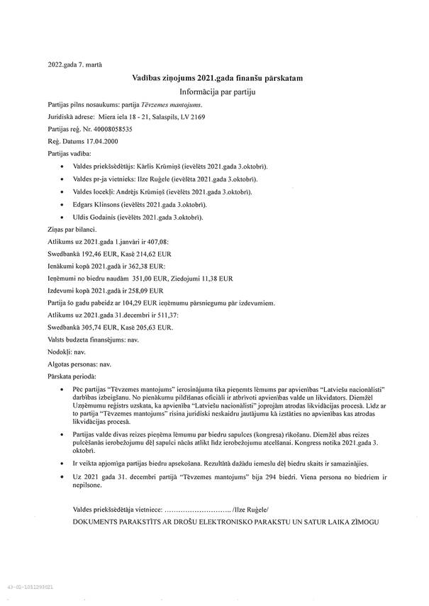 Politiskās partijas "Tēvzemes mantojums", reģ. Nr. 40008058536, 2021.gada pārskats